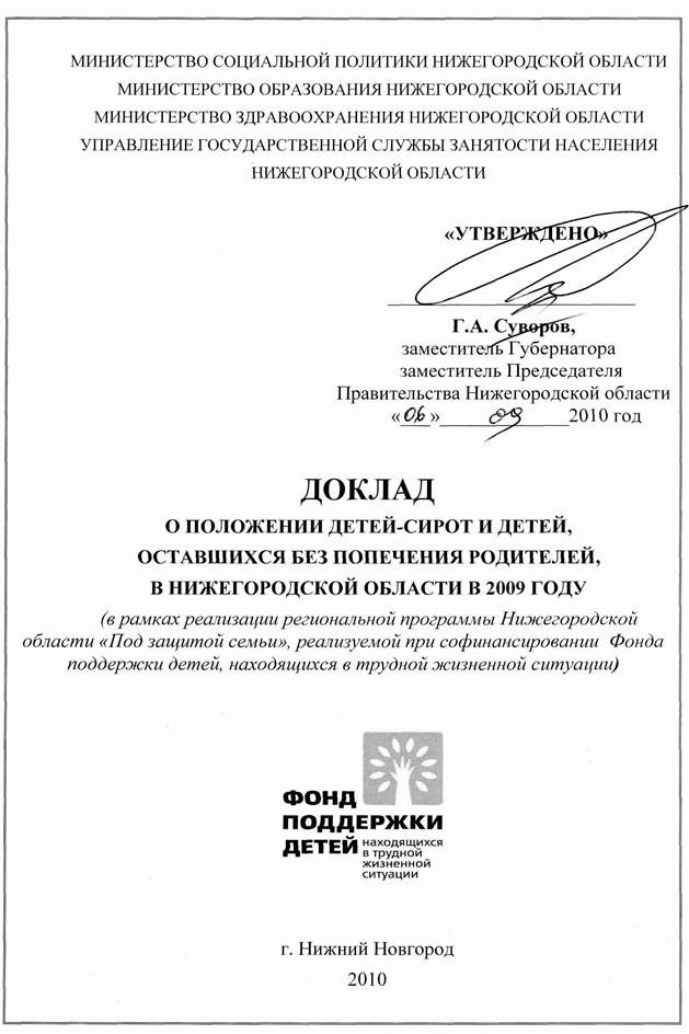 Доклад подготовлен в рамках реализации региональной программы «Под защитой семьи», утвержденной постановлением Правительства Нижегородской области от 10.07.2010 года № 480. Реализация данной программы осуществляется при софинансировании Фонда поддержки детей, находящихся в трудной жизненной ситуации. Региональная программа «Под защитой семьи» направлена на создание условий для обеспечения прав детей на воспитание и заботу в семье путем развития института замещающей семьи в Нижегородской области и формирования эффективной системы жизнеустройства детей-сирот и детей, оставшихся без попечения родителей.