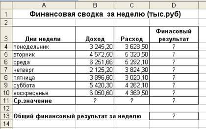 Введите заголовок таблицы «Финансовая сводка за неделю (тыс. р.)», начиная с ячейки А1.