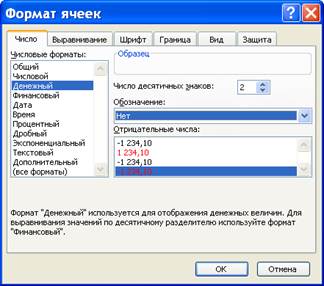 6. Для ячеек с результатом расчетов задайте формат «Денежный» с выделением отрицательных чисел красным цветом (рис.1.3) (Формат/Ячейки /вкладка Число/формат Денежный/ отрицательные числа — красные. Число десятичных знаков задайте равное двум).