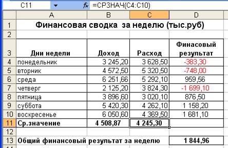 В ячейке D13 выполните расчет общего финансового результата (сумма по столбцу «Финансовый результат»). Для выполнения автосуммы удобно пользоваться кнопкой Автосуммирования (∑) на панели инструментов или функцией СУММ. В качестве первого числа выделите группу ячеек с данными для расчета суммы — D4:D10.