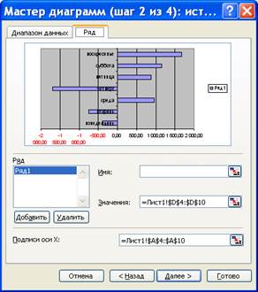 Для этого выделите интервал ячеек с данными финансового результата D4:D10 и выберите команду Вставка/Диаграмма. На первом шаге работы с мастером диаграмм выберите тип диаграммы — линейчатая; на втором шаге на вкладке Ряд в окошке Подписи оси Х укажите интервал ячеек с днями недели — А4:А10 (рис. 1.5).