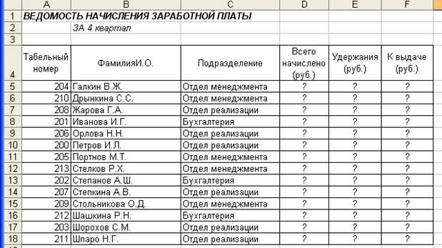 Проведите форматирование заголовка таблицы. Для этого выделите интервал ячеек от А1 до D1, объедините их кнопкой панели инструментов Объединить и поместить в центре или командой меню Формат/Ячейки/вкладка — Выравнивание/отображение – Объединение ячеек.