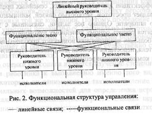 При создании функциональной структуры на среднем уровне управления организуются функциональные звенья. Это органы, выполняющие специализированные функции, которые руководят линейными руководителями нижнего уровня (младшие начальники). К стандартным функциональным звеньям на Западе относятся отдел кадров, отдел маркетинга, финансовый отдел, отдел МТС. Каждое среднее звено имеет право руководить нижним уровнем (рис.2).