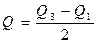 Квартильное отклонение (Q) – применяется для характеристики вариации признака в совокупности. Может использоваться вместо размаха вариации во избежание недостатков, связанных с использованием крайних значений.