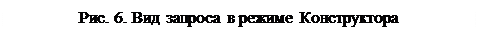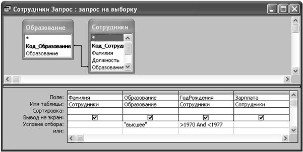 Изменение макета запросов производится в режиме Конструктора запросов. На рис. 6 в качестве примера показан вид запроса на выборку данных о сотрудниках с высшим образованием, родившихся в период с 1971 по 1976 гг.