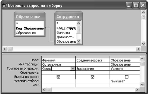 В рассматриваемом примере имеет смысл включить следующие поля: поле «Образование» для того, чтобы задать условие; поле «Год рождения» для вычисления среднего возраста; поле «Фамилия» (или любое другое) для подсчета числа сотрудников в отобранной группе.