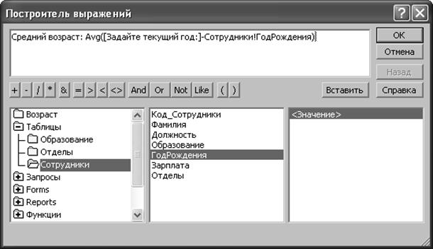 Если использовать значение поля в качестве аргумента статистической функции недостаточно (например, требуется усреднять возраст сотрудника, а в поле записан год его рождения) или требуется осуществить более сложные вычисления, следует воспользоваться Построителем выражений (рис. 8).