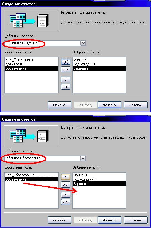В нашем случае требуется создать отчет для передачи всех данных из основной таблицы в Excel. Отчет можно составлять и по одной главной таблице, но если это сделать, то в поле, использующем подстановку вместо реального текста будет стоять код поля (порядковый номер во вспомогательной таблице). По этой причине включаем в него все поля основной таблицы «Сотрудники», кроме тех, которые используют подстановку. Эти пропущенные поля следует включить из вспомогательных таблиц «Должности» и «Образование». Пояснения на рисунке на следующей странице.