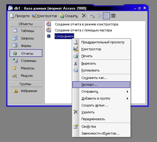 Когда отчет будет создан его надо экспортировать в Excel, щелкнув правой кнопкой по названию отчета в окне базы данных на странице «Отчеты» - рисунок приводится ниже по тексту.