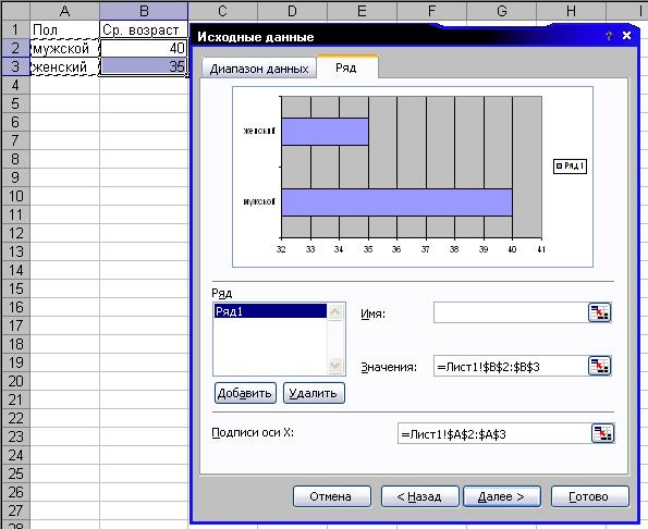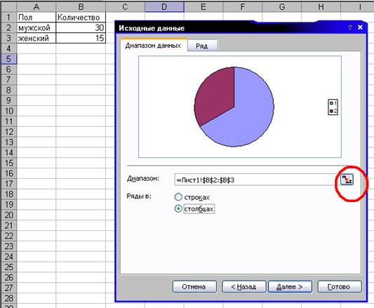 Некоторые пользователи этот этап предпочитают осуществлять по-другому – сначала выделить мышью ячейки с результатами (у нас это В2:В3), а потом вызывать Мастер диаграмм. В этом случае Диапазон заполнится автоматически.