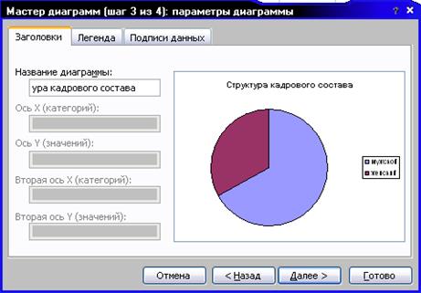 В следующем окне можно задать название диаграммы (закладка «Заголовки», а на закладке «Подписи данных» отметить необходимый вариант подписи секторов (на рис. Д подписываются проценты).