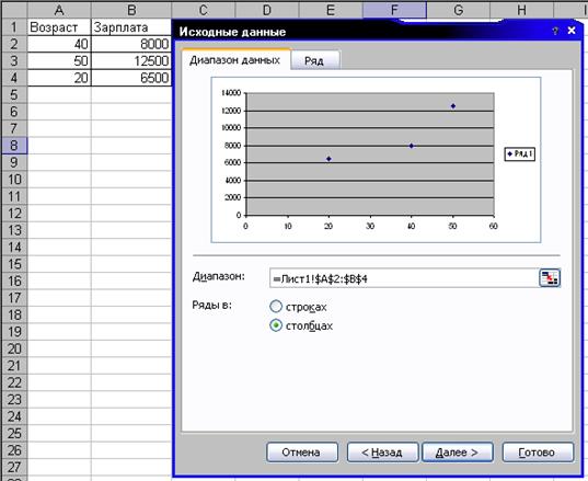 Точечная диаграмма строится аналогичным образом. Обратите внимание на заполнение окна «Исходные данные»