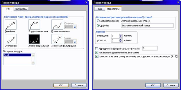 После стандартного завершения всех этапов построения графика на нем следует добавить тренд – график математической функции, похожей на статистическую закономерность. Для этого надо выделить диаграмму и щелкнуть правой кнопкой мыши по одной из точек графика. В появившемся меню следует выбрать «Добавить линию тренда». Далее в диалоговом окне отметить то, что нужно в Вашем случае. Пример – на рисунке.