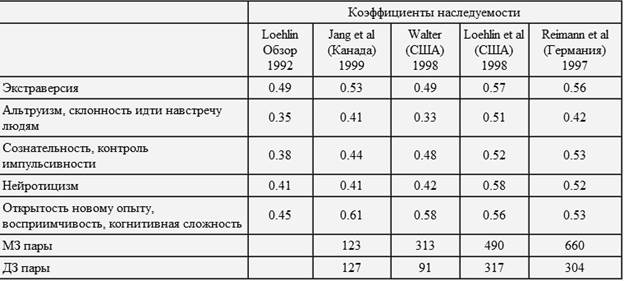 В одном из последних обзоров Т. Бушар и Дж. Лоэлин приводят сводку коэффициентов наследуемости факторов Большой пятерки по результатам близнецовых исследований, проводившихся в странах Европы и Америки