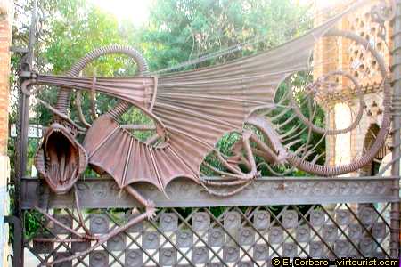 Къщичката на портиера представлява едноетажен октагон, увенчан със своеобразен купол. Между нея и конюшните лежи едно от най-забележителните творения на Гауди, първото в което се забелязват красноречиви влияния от Ар Нуво, а именно портата от ковано желязо (материал към който архитекта има особено отношение). Широка над 4,5 метра, тя се състои от едно единствено парче метал; закрепена е шарнирно само от едната страна. Поради това се налага използването на доста висок ок. Вратата е прикачена към колона с изображение на дърво със златни ябълки. Долната част на самата порта пък представлява плетеница от извити пръти. В ромбовидните отвори на тази мрежа са поставени плочки от ковано желязо. Върху тази основа стои (в горната половина на портата) дракон с разперени крила и зинала паст. Така в композиция с дървото той представлява митологема от древногръцкия мит за последния дванадесети подвиг на Херкулес — той трябвало да донесе от градината на Хесперидите, Атласови дъщери, трите златни ябълки от златното дърво на Хера.
