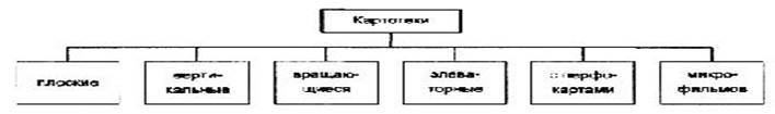 Разработано и применяется большое число конструкций различных картотек: плоских, вертикальных, вращающихся и др. Карты в картотеках располагаются по порядковым номерам, алфавиту, по темам, а иногда и произвольно. Для облегчения поиска карт в массиве применяются разделители (индикаторы) с четко видимыми классификационными признаками подмассивов. Плоские картотеки – карточки располагаются таким образом, чтобы один из краев последующей карты выступал из-под всех предыдущих и можно было бы видеть идентификатор каждой карты.