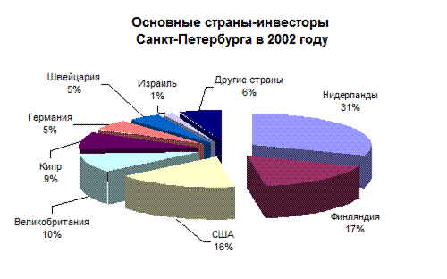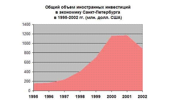 Санкт-Петербург входит в тройку лидеров регионов России по привлекательности для инвестиций. В то же время, по мнению большинства экспертов, инвестиционный потенциал города реализуется очень слабо. Объем прямых иностранных инвестиций, осуществляемых в городах Восточной Европы, если пересчитать их на душу населения, превышает от 7 до 10 раз уровень Санкт-Петербурга. В структуре иностранных инвестиций в Санкт-Петербург за 2002 год прямые инвестиции составили всего 9,5% от общего объема 881 млн. долларов США.