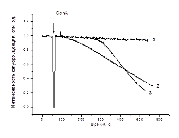 В ходе экспериментов было обнаружено, что базальный уровень флуоресценции скополетина, находящегося в клеточной среде в отсутствие и в присутствие MbCD, практически не изменялся (рисунок 3.3, кривая 1). При добавлении лектина ConA к суспензии клеток после небольшого промежутка времени (лаг-периода) наблюдалось снижение интенсивности флуоресценции скополетина (рисунок 3.3, кривая 2), свидетельствующее об активации НАДФН-оксидазы и продукции Н2 О2 лектин-активированными нейтрофилами.