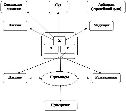 На уровне парного взаимодействия нет других форм разрешения конфликта, кроме указанных выше. Но взаимодействие конфликтующих сторон может быть перенесено на другой уровень, если привлечь к разрешению конфликта третью сторону - “Z”. Тогда возникают новые способы выхода из конфликта.