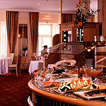 Вас ждет роскошный "шведский стол": богатый выбор закусок, ароматных супов, мясных и рыбных горячих блюд, а также разнообразные десерты и ассорти отборных сыров.