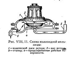 Более тонкого диспергирования добиваются в коллоидных мельницах различных конструкций, принцип действия которых основан на развитии разрывающих усилий в суспензии или эмульсии под действием центробежной силы в узком зазоре между вращающимся с большой скоростью ротором и неподвижной частью устройства – статором. Взвешенные крупные частицы испытывают при этом значительное разрывающее усилие и таким образом диспергируются. Тип коллоидной мельницы, широко распространенный в настоящее время, изображен на рис. 1 (смотри приложение). Эта мельница состоит из ротора, представляющего конический диск 1, сидящий на валу 2, и статора 3. Ротор приводится во вращение с помощью специального расположенного вертикально мотора, совершающего обычно около 9000 об/мин. Рабочие поверхности ротора и статора 4 пришлифованы друг к другу и толщина щели между ними составляет около 0,05 мм. Грубая суспензия полается в мельницу по трубе 5 под вращающийся диск центробежной силой, развивающейся в результате вращений ротора, проталкивается через щель и затем удаляется из мельницы через трубу 6. При прохождении жидкости в виде тонкой пленки через щель взвешенные в жидкости частицы испытывают значительные сдвиговые усилия и измельчаются. Степень дисперсности полученной системы зависит от толщины щели и скорости вращения ротора: чем меньше зазор и больше скорость, тем больше сдвиговое усилие и следовательно, выше будет дисперсность.