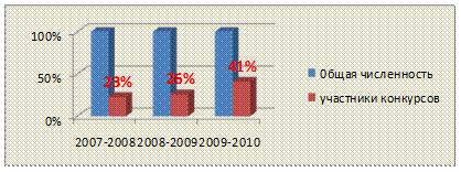 Диаграмма показывает, сколько человек приняло участие в конкурсах, самыми активными из них являются 27% коллектива, они принимают участие в 35% конкурсов.