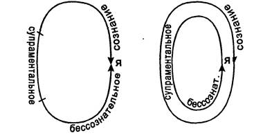 Для наглядности это отображено на схеме, в левой части которой Я является барьером и источником конфликтов между бессознательным и сознанием, а в правой - Я установило контакт, мостик с бессознательным и получает информацию как от сознания так и от бессознательного. Кроме того, и сознание и бессознательное оказывают друг на друга конструктивное влияние, а Я выполняет уже не тормозящую, а стимулирующую функцию, способствует установлению равновесия между этими мирами.