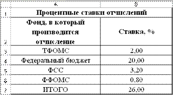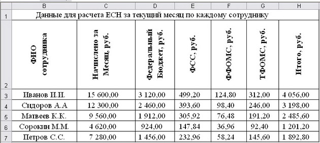 8. На рабочем листе Сотрудники MS Excel создать таблицу, в которой будут содержаться данные для расчета ЕСН за текущий месяц по каждому сотруднику.