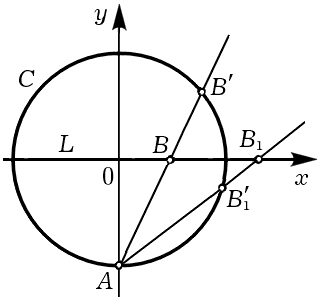 Поясним сказанное на примере. Пусть задана окружность C : x 2 + y 2 = 1 и любая прямая с рациональными коэффициентами, например, L : y =0. Покажем, что рациональные точки этой окружности и прямой можно поставить во взаимно однозначное соответствие. Это можно сделать, например, так: закрепим точку A (0,–1) окружности и поставим в соответствие каждой рациональной точке B прямой L точку B' окружности C , лежащую на пересечении C и прямой AB (рис. 1). То, что координаты точки B' будут рациональными, предоставим читателю доказать самому либо прочесть аналогичное доказательство у Диофанта (оно будет изложено в следующем параграфе). Очевидно, что такое же соответствие можно установить между рациональными точками любого конического сечения, если на нём лежит хотя бы одна рациональная точка, и рациональной прямой. Мы видим, что с точки зрения диофантова анализа окружность C и прямая L неотличимы: множества их рациональных решений эквивалентны. И это несмотря на то, что порядки обеих кривых различны.