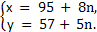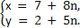. Из полученного равенства видно, что число (х – 7) будет целым тогда и только тогда, когда (у – 2) делится на 5, т.е. у – 2 = 5n, где n какое-нибудь целое число. Итак, у = 2 + 5n, х = 7 + 8n, где n