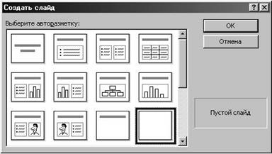 После нажатия на кнопку ОК на экране появляется рабочее поле Power Point, в котором располагается окно Создать слайд. В этом окне можно выбрать готовый шаблон слайда, предназначенный для последующего заполнения.