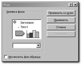 Для создания фона в слайде выберите в главном меню пункт Формат . Выбрав команду Формат-Цветовая схема слайда , Вы можете поменять цвета для стандартных схем слайдов (заголовки, тени, фон и т.д.). Если после выбора схемы Вы дадите команду Применить ко всем , то схема будет применена ко всем слайдам презентации.