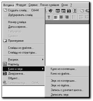 Для создания следующего слайда выберите из главного меню команду Вставка-Создать слайд . Выберите пустой слайд и на экране появится заготовка для главного меню.