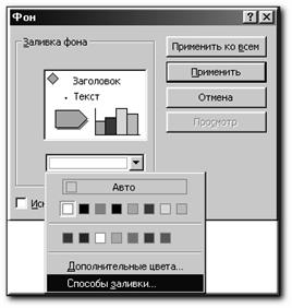 Выберите на главном меню команду Формат-Фон . Команда Дополнительные цвета предлагает однотонные цвета. Команда Способы заливки – Узоры, Рисунки, Градиентные заливки, Текстуры. Остановим свой выбор на текстуре.