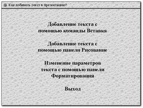 В правой части слайда напечатайте заранее подготовленный текст. Если необходимо – измените его атрибуты. Практически второй слайд закончен, но по сценарию нам необходимо организовать возврат к слайду – меню. Такое действие обычно возлагают на управляющие кнопки..