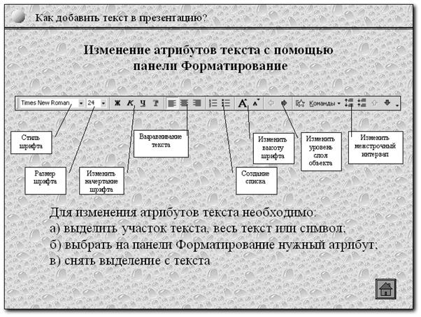 В верхней части слайда поместим заголовок «Изменение атрибутов текста с помощью панели Форматирование», используя кнопку Надпись панели Рисование. По команде Вставка-Рисунок-Из файла вставим графический файл Рис3.bmp, на котором изображена панель Форматирование. Используя команду Автофигуры-Выноски, разместим выноски под панелью Форматирование. Стрелки указатели направим на окна и кнопки панели, как показано на рисунке и поместим на вставки соответствующие подписи.