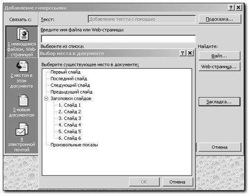 Выделим в объекте Надпись текст , соответствующий названию первого раздела и выполним команду Вставка-Гиперссылка . В появившемся окне нажмем кнопку Закладка и окажемся в следующей ситуации: