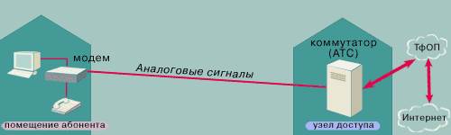 Телефонный аппарат, установленный у вас дома или в офисе, соединяется с оборудованием телефонной станции с помощью витой пары медных проводов. Традиционная телефонная связь предназначена для обычных телефонных разговоров с другими абонентами телефонной сети. При этом по сети передаются аналоговые сигналы. Телефонный аппарат воспринимает акустические колебания (являющиеся естественным аналоговым сигналом) и преобразует их в электрический сигнал, амплитуда и частота которого постоянно изменяется. Так как вся работа телефонной сети построена на передаче аналоговых сигналов, проще всего, конечно же, использовать для передачи информации между абонентами или абонентом и провайдером именно такой метод. Именно поэтому вам пришлось прикупить в дополнение к вашему компьютеру еще и модем, который позволяет демодулировать аналоговый сигнал и превратить его в последовательность нулей и единиц цифровой информации, воспринимаемой компьютером.