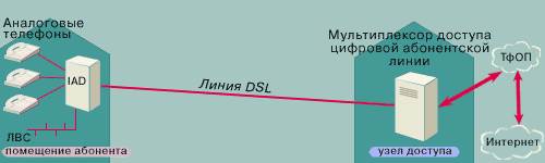 На абонентской стороне линии, идущие от телефонных аппаратов и, например, компьютеров, подключаются к устройству интегрированного доступа, позволяющего преобразовать аналоговый сигнал телефонной связи в цифровую форму, объединить его с данными, поступающими от компьютеров, и все это передать в виде цифрового высокочастотного сигнала на телефонную станцию.