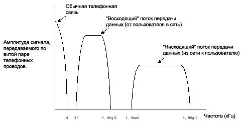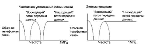 Технология ADSL использует метод разделения полосы пропускания медной телефонной линии на несколько частотных полос (также называемых несущими). Это позволяет одновременно передавать несколько сигналов по одной линии. Точно такой же принцип лежит в основе кабельного телевидения, когда каждый пользователь имеет специальный преобразователь, декодирующий сигнал и позволяющий видеть на экране телевизора футбольный матч или увлекательный фильм. При использовании ADSL разные несущие одновременно переносят различные части передаваемых данных. Этот процесс известен как частотное уплотнение линии связи (Frequency Division Multiplexing — FDM) (смотрите рисунок 3). При FDM один диапазон выделяется для передачи «восходящего» потока данных, а другой диапазон для «нисходящего» потока данных. Диапазон «нисходящего» потока в свою очередь делится на один или несколько высокоскоростных каналов и один или несколько низкоскоростных каналов передачи данных. Диапазон «восходящего» потока также делится на один или несколько низкоскоростных каналов передачи данных. Кроме этого может применяться технология эхокомпенсации (Echo Cancellation), при использовании которой диапазоны «восходящего» и «нисходящего» потоков перекрываются (смотрите рисунок 3) и разделяются средствами местной эхокомпенсации.