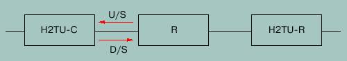 Система HDSL2 транспортирует сигналы T1(E1) между узлом доступа, который обычно совпадает с местной АТС, и помещением пользователя. Модем узла доступа (по аналогии с прототипом HDSL) обозначается H2TU-C, а модем пользователя — H2TU-R. При необходимости между узлом доступа и помещением пользователя может быть установлен промежуточный регенератор R. На узле доступа модемы H2TU-C множества систем HDSL-2 располагаются в конструктиве мультиплексора доступа DSLAM, т.е., пространственно сближены, в отличие от пространственно разнесённых модемов пользователей H2TU-R. Поэтому переходное влияние на ближнем конце NEXT, которое является определяющим типом помех в системах типа HDSL, использующим метод эхо компенсации, будет практически проявляться только в узле доступа. При этом сигнал нисходящего направления передачи (от сети к пользователю) D/S (downstream) будет основной помехой для сигнала восходящего направления передачи U/S (upstream) на приёме H2TU-C от пользователя. Таким образом, при прочих равных условиях мощность переходных помех, действующих на HTU-C, больше мощности помех, которые влияют на работу HTU-R. Именно поэтому сигналы D/S и U/S системы HDSL2, представленные на рис.2, имеют различную ширину и форму частотного спектра. Тем самым учитывается наихудший случай применения модемов HDSL-2, который может иметь место в реальных условиях.