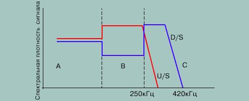 Заметим, что именно такая своеобразная форма спектров сигналов в области частот 200 — 250 кГц, когда спектральная плотность сигнала U/S поднята, а спектральная плотность сигнала D/S опущена по сравнению с соседними частотами, и послужила причиной появления в названии этой достаточно экзотической системы слова «interlocking», что можно перевести как «сцепленный» или «сблокированный» спектр.
