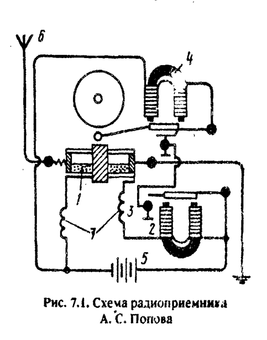 Изучив работы английского ученого О. Лоджа и французского физика Бранли и исследовав электропроводные свойства порошков различных металлов, А. С. Попов создал более совершенный, безотказно действующий индикатор электромагнитных волн и предложил оригинальный метод встряхивания когерера с помощью электромагнитного звонкового реле. Э. Бранли для восстановления чувствительности когерера встряхивал его руками. О. Лодж предложил для этих целей использовать часовой механизм. Но как автоматизировать этот процесс? Как «заставить» электромагнитную волну, воздействующую на когерер, автоматически восстановить его чувствительность? Эту проблему впервые успешно решил А. С. Попов. Присоединив к когереру вертикальный провод, он создал простейшую приемную антенну. Приемник А. С. Попова (рис. 7.1) работал следующим образом: при воздействии электромагнитной волны на когерер 1 металлические опилки слипались, сопротивление цепи уменьшалось, и якорь электромагнитного реле 2 притягивался и замыкал контактом 3 цепь «батарея 5 — звонковое реле 4», молоточек звонка притягивался к электромагниту, звонок фиксировал прием сигнала, при этом электрическая цепь размыкалась, и молоточек звонка, возвращаясь в исходное положение, ударял по когереру и восстанавливал его чувствительность; 6 — антенна; 7 — индуктивные катушки, повышавшие устойчивость работы приемника. Седьмого мая 1895 г. Попов публично демонстрировал радиоприемник, а в сентябре того же года, присоединив к схеме телеграфный аппарат Морзе, ввел запись принимаемых сигналов на ленту. Радиоприемник Попова — одно из наиболее совершенных электромагнитных автоматических устройств своего времени. Именно поэтому, а также вследствие большого влияния радиотехники на развитие промышленной электроники, здесь кратко рассмотрены первые шаги радиотехники.