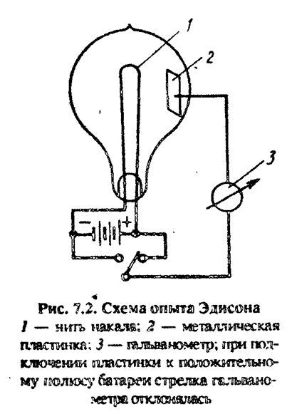 Изобретение электронной лампы дало мощный импульс в развитии радиотехники. Действие электронной лампы основано на явлении термоэлектронной эмиссии, впервые наблюдавшемся, Эдисоном в 1883 г. и известном под названием «эффекта Эдисона». Занимаясь усовершенствованием электрических ламп накаливания, Эдисон обратил внимание на то, что стеклянная колба лампы сравнительно быстро покрывается темным налетом, а угольная нить перегорает. Стремясь увеличить срок службы нити и выяснить причины потемнения колбы, Эдисон произвел ряд экспериментов и обнаружил, что между угольной нитью и пластинкой (рис. 7.2) проходит электрический ток. Вначале это явление не получило правильного объяснения, но после открытия электрона было установлено, что Эдисон наблюдал эмиссию электронов. Дальнейшее изучение процессов происходивших в электрической лампе, внутри которой находился металлический электрод, соединенный с источником напряжения, показало, что подобное устройство способно пропускать ток только в одном направлению, то есть служить выпрямителем. В 1904 г, английский ученый Я; А. Флеминг разработал конструкцию двухэлектродной лампы — диода и предложил применять его в качестве детектора в радиоприемных устройствах. Но диоды, будучи еще несовершенными электровакуумными приборами, около 10 лет не получали широкого применения.