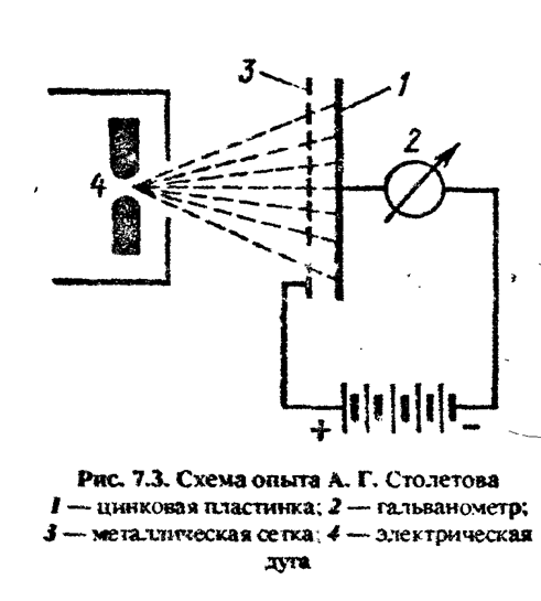 Наиболее полное исследование явления внешнего фотоэффекта принадлежит А. Г. Столетову, схема одного из опытов которого изображена на рис. 7.3. Им было не только доказано, что отрицательно заряженный проводник теряет заряд при освещении его лучами света, но установлен закон пропорциональности между фототоком и интенсивностью световых лучей. Важное значение для последующего практического применения фотоэффекта имело установление Столетовым безынерционности этого явления. Им впервые были проведены исследования фотоэффекта в условиях вакуума. Созданная для этих целей установка явилась, по существу, первым вакуумным фотоэлементом. Первые практически пригодные вакуумные элементы с катодами из щелочных металлов были созданы в 1910 г. (Ю. Эльстер и Г Гейгер).