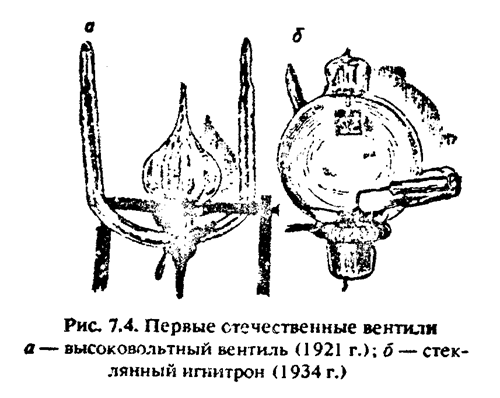В нашей стране первыми появились стеклянные ртутные вентили, изготовленные в 1921 г. Нижегородской радиолабораторией для выпрямительной высоковольтной (на 4 кВ) установки Свердловской, радиостанции. К концу 20-х годов было налажено производство высоковольтных (до 15 кВ) и низковольтных вентилей (250 В, 100 А).