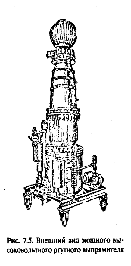 Еще недавно мощные ртутные вентили использовались в преобразовательных установках, общая мощность которых достигала десятков миллионов киловатт, в частности, в дальних линиях электропередач постоянного тока. Такие ртутные вентили выдерживали рабочее напряжение до 100 кВ при максимальных токах до 900 А (рис. 7.5). Но успехи современной Полупроводниковой техники позволили создать мощные полупроводниковые тиристоры, которые имеют преимущества перед ртутными вентилями.