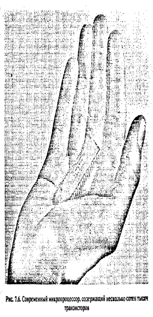 На основе БИС оказалось возможным создание важнейших элементов современных электронных устройств — микропроцессоров (рис. 7.6) и микроЭВМ. Микропроцессор — управляющее цифровое устройство, выполненное по технологии больших интегральных схем (чаще на одном кристалле полупроводника) и способное осуществлять под программным управлением обработку различной информации, арифметические и логические операции. Общая структура микропроцессора почти не отличается от структуры центрального процессора малых ЭВМ.