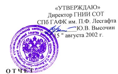 Научный отчет по теме: «Исследование эффективности универсальной компьютерной лечебно диагностической и профилактической системы «Странник» для практической реализации государственной программы Российской Федерации «Здоровье нации» и оздоровления различных групп населения», соответствующей проблеме 01.02.00: «Методология и технология оздоровления различных социально-демографических групп населения» Сводного пятилетнего плана НИР Государственного комитета Российской Федерации по физической культуре, спорту и туризму, изложен на 32 страницах машинописного текста, содержит 2 главы, 6 таблиц, 4 рисунка заключение и выводы.