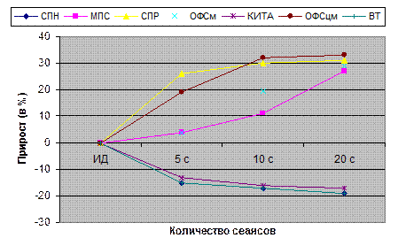 После 10 терапевтических сеансов существенно снизилась частота сердечных сокращений в покое (ЧССп) на 6 % (Р « 0,001) и частота сердечных сокращений в восстановительном периоде (ЧССв) на 1,2 % (недостоверно), что свидетельствует о повышении экономичности деятельности сердца и скорости восстановления пульса. При этом значительно повысилась мощность работы (Nр) на велоэргомегре (на 7,2%; Р « 0,01} и скоростная выносливость (КСВ) на 10,5% (Р « 0,01). Достоверно повысились специальные коэффициенты, рассчитываемые по соотношению мощности работы и ее пульсовой стоимости: коэффициент экономичности деятельности сердца (КЭДС) - на 7,1% (Р « 0,001), скорость восстановления пульса (СВП) - на 8,8% (Р « 0,001) и общий коэффициент полезного действия (ОКПД) систем организма - на 7,8 % (Р « 0,001), характеризующий как эффективность деятельности систем обеспечивающих не посредственное осуществление движений, так и систем энергообеспечения мышечной деятельности.